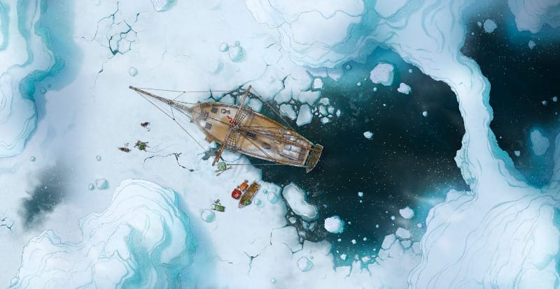 This map is ideal for high-tension wilderness encounters on the frigid floes, whether the party is investigating the fate of the stranded vessel, racing to save sailors and supplies before the ice gives way, or simply navigating the deadly expanse against the winter elements.