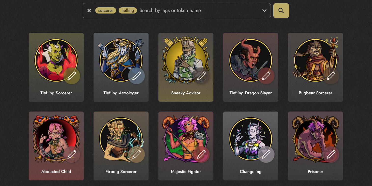Note that the results will show you if a specific token includes a variant that can fit your needs: for example, elf tokens might have a setting to get rounded ears and then be included in a search for "human". Similarly, tieflings could appear in many different types of tokens!