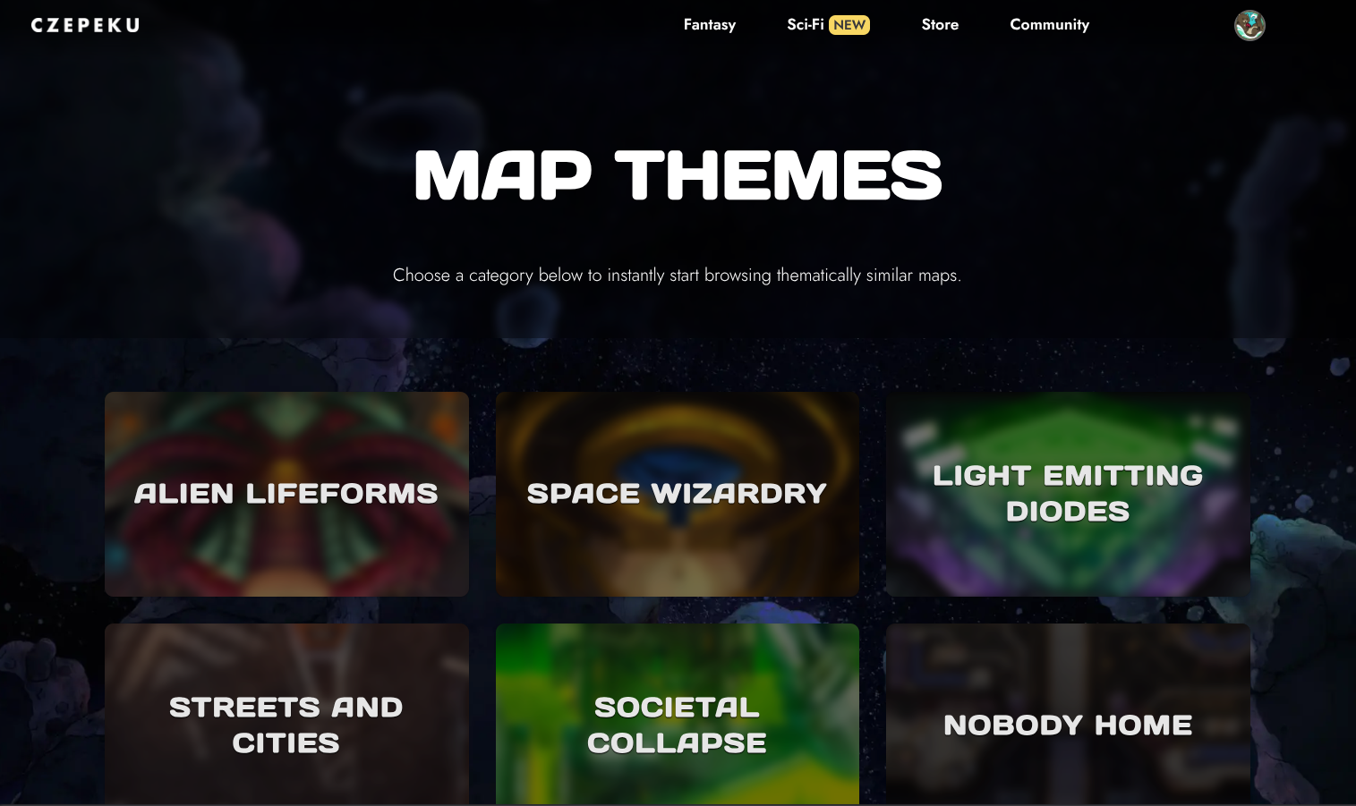 At the top of the map and scenes catalogues, you'll see a "Theme" button that will bring you to a list of themes: from "Greener Pastures" to "Arcane Machinations", each theme contains dozens of variations selected by our team to help inspire you.